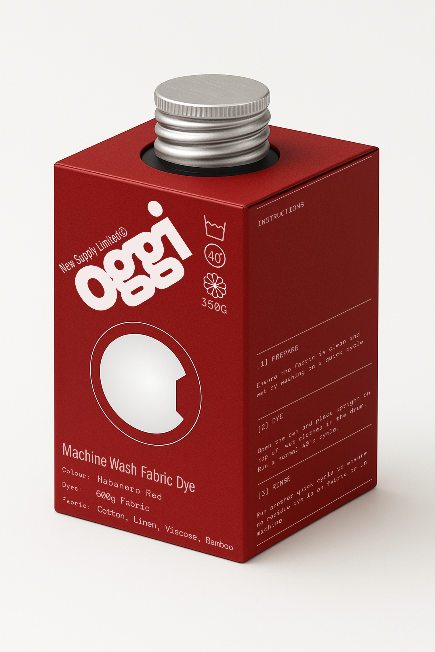 oggi is an easy-to-use fabric dye designed for your washing machine. One bottle dyes 600g of cotton, linen, bamboo or viscose and gives your fabric a new and long-lasting colour